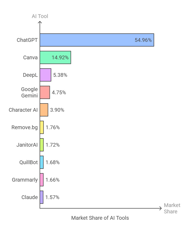 We also calculated the total traffic volume of all 20 tools to generate the estimated market share for each individual AI tool. All traffic data comes from August 2024 traffic estimates.